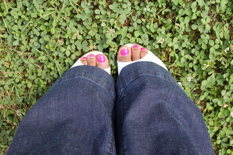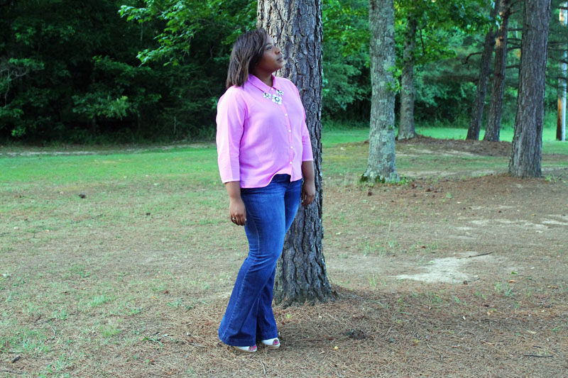 {Neon Pink Thrifted Blouse, Flare Jeans, Charlotte Russe Wedges, NY&Co Necklace}